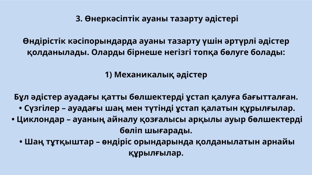 3. Өнеркәсіптік ауаны тазарту әдістеріӨндірістік кәсіпорындарда ауаны тазарту үшін әртүрлі әдістер