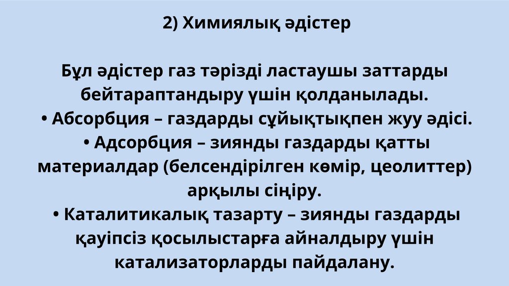 2) Химиялық әдістерБұл әдістер газ тәрізді ластаушы заттарды