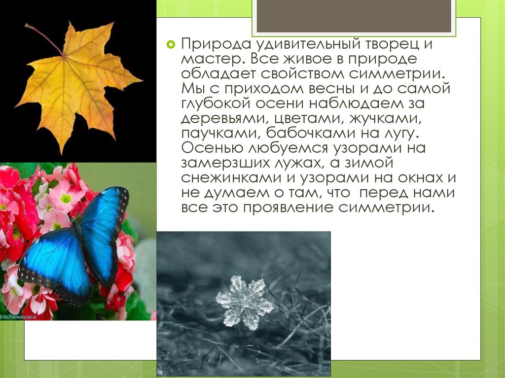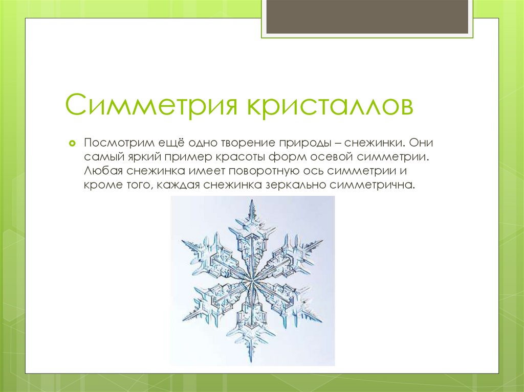 Посмотрим ещё одно творение природы – снежинки. Онисамый яркий пример красоты форм осевой симметрии.