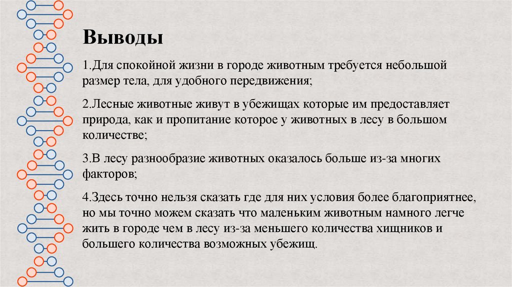 Выводы1.Для спокойной жизни в городе животным требуется небольшой