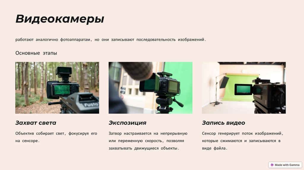 Видеокамерыработают аналогично фотоаппаратам, но они записывают последовательность изображений.