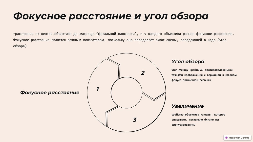 Фокусное расстояние и угол обзора-расстояние от центра объектива до матрицы (фокальной плоскости), и у каждого объектива разное фокусное расстояние.