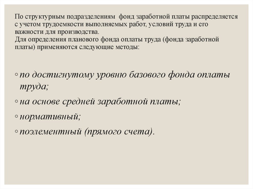 По структурным подразделениям фонд заработной платы распределяетсяс учетом трудоемкости выполняемых работ, условий труда и его
