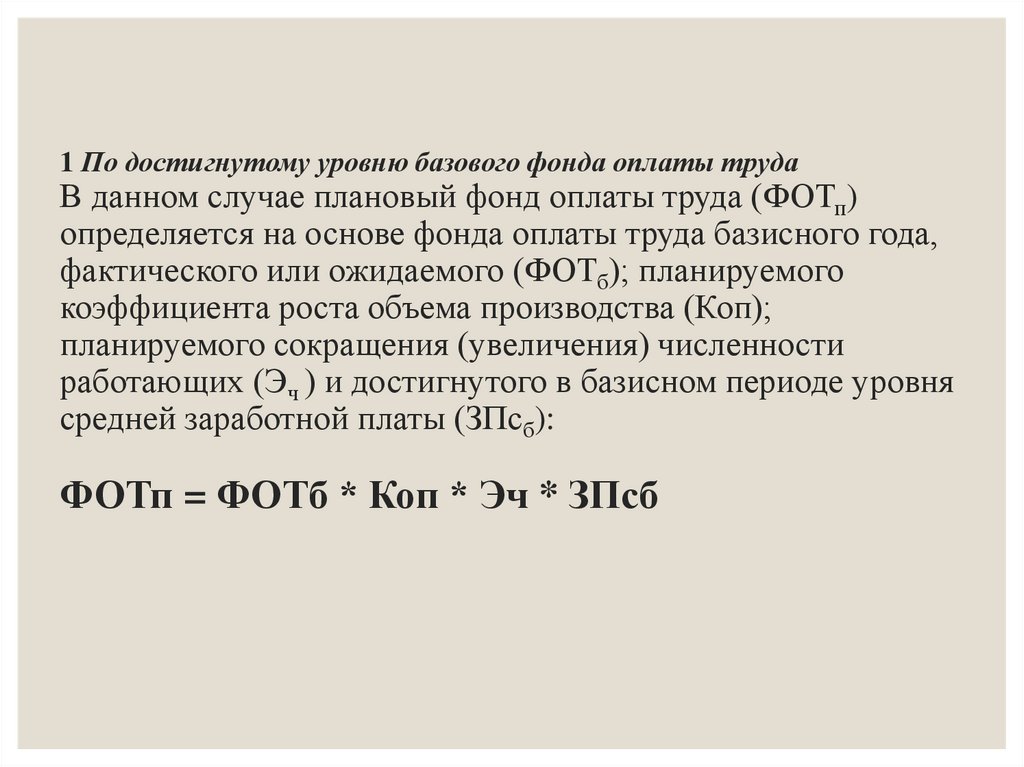 1 По достигнутому уровню базового фонда оплаты трудаВ данном случае плановый фонд оплаты труда (ФОТп)