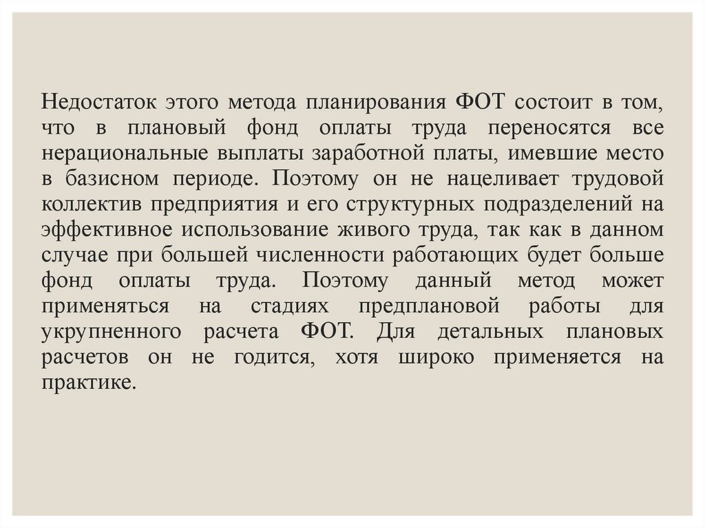 Недостаток этого метода планирования ФОТ состоит в том,что в плановый фонд оплаты труда переносятся все