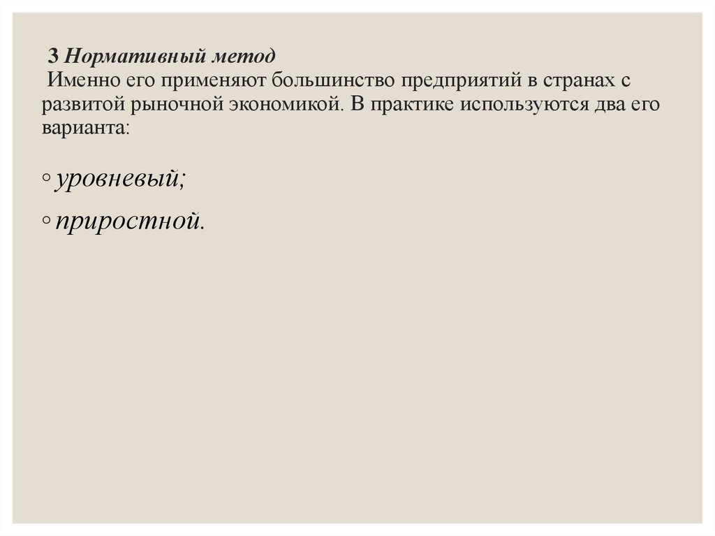 3 Нормативный методИменно его применяют большинство предприятий в странах с