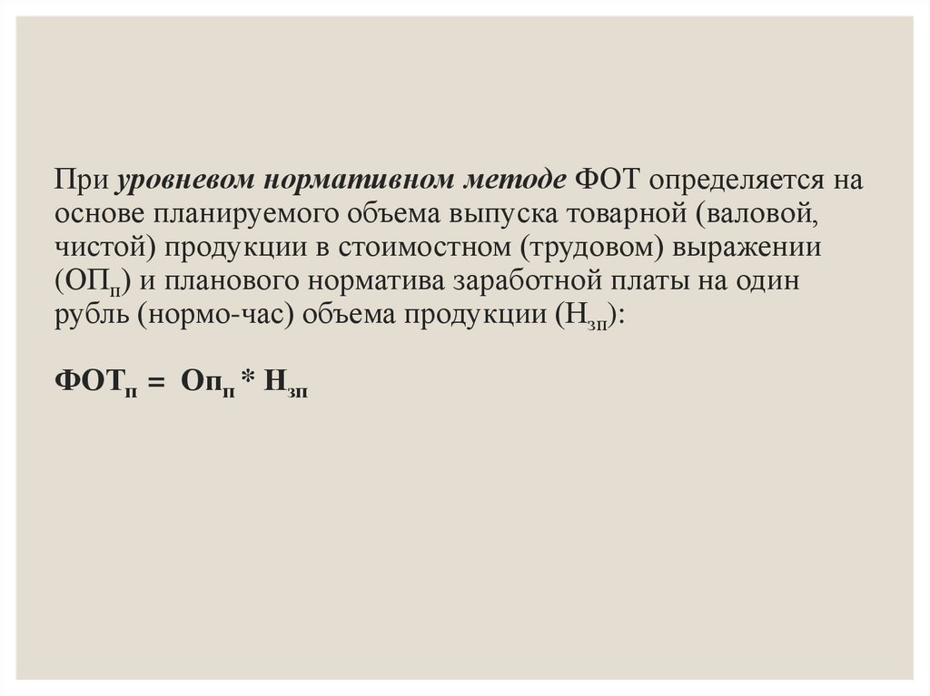 При уровневом нормативном методе ФОТ определяется наоснове планируемого объема выпуска товарной (валовой,