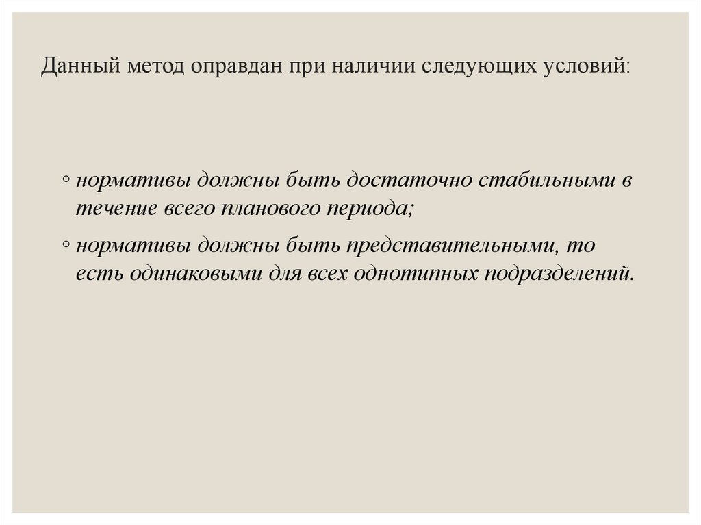 Данный метод оправдан при наличии следующих условий:◦ нормативы должны быть достаточно стабильными в