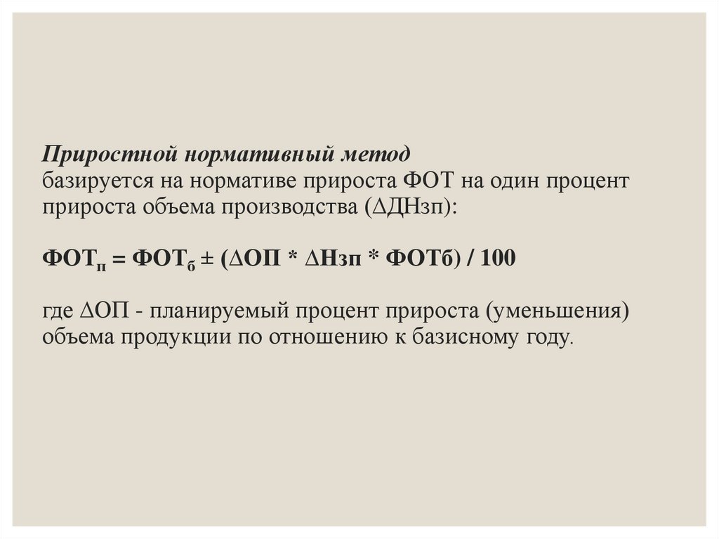 Приростной нормативный методбазируется на нормативе прироста ФОТ на один процент