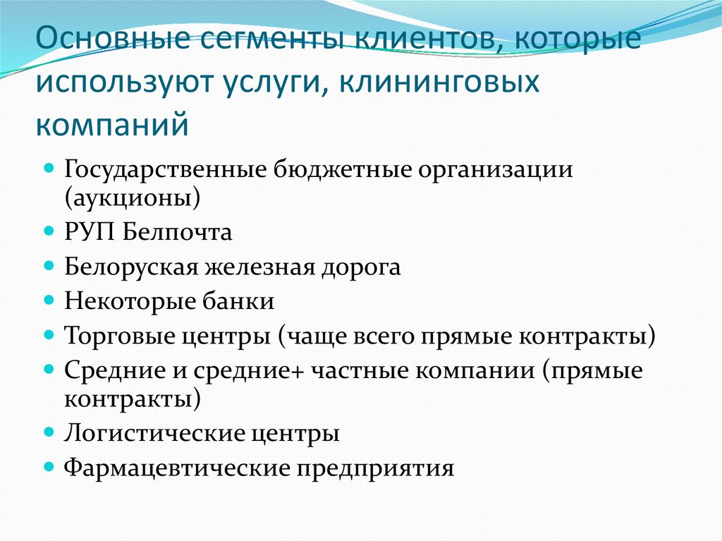 Основные сегменты клиентов, которыеиспользуют услуги, клининговых