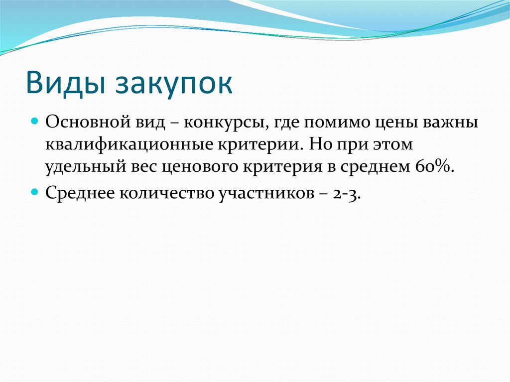Виды закупокОсновной вид – конкурсы, где помимо цены важны