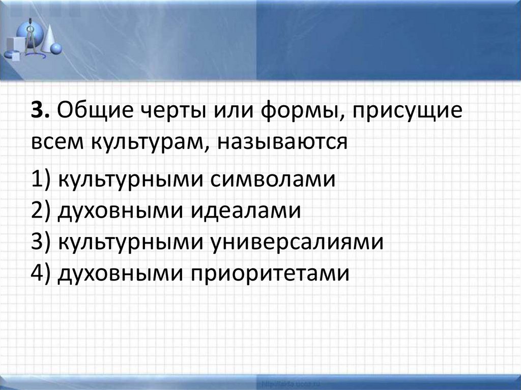 3. Общие черты или формы, присущиевсем культурам, называются