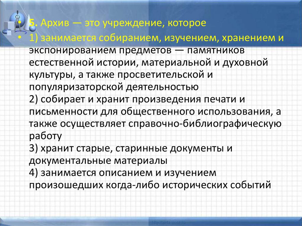 • 5. Архив — это учреждение, которое• 1) занимается собиранием, изучением, хранением и