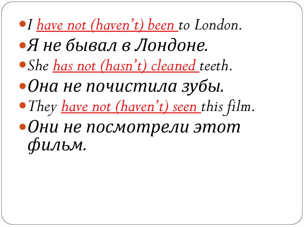 I have not (haven’t) been to London.Я не бывал в Лондоне.
