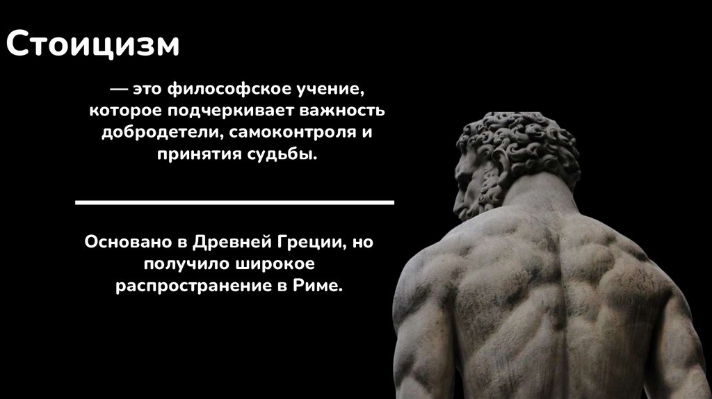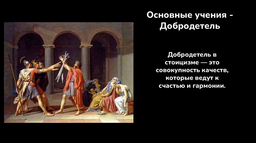 Стоицизм: Добродетель, самоконтроль, принятие судьбы.