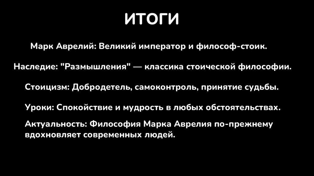ИТОГИМарк Аврелий: Великий император и философ-стоик.