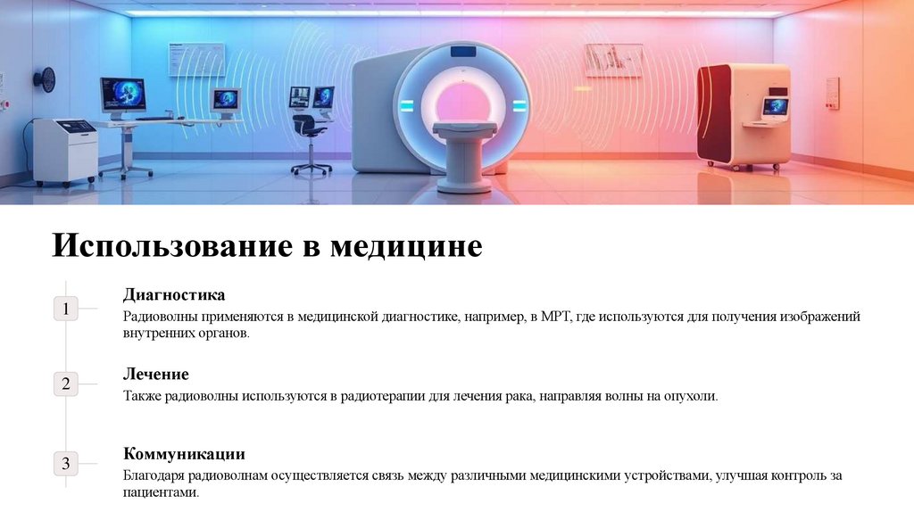 Также радиоволны используются в радиотерапии для лечения рака, направляя волны на опухоли.