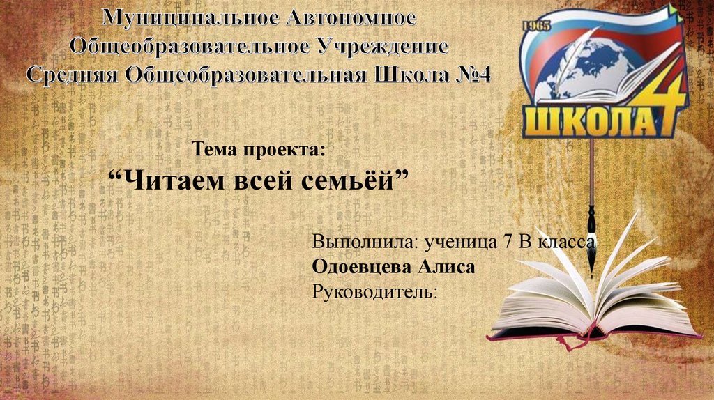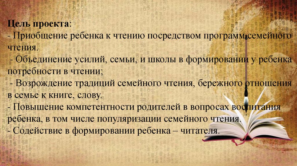 Цель проекта:- Приобщение ребенка к чтению посредством программ семейного