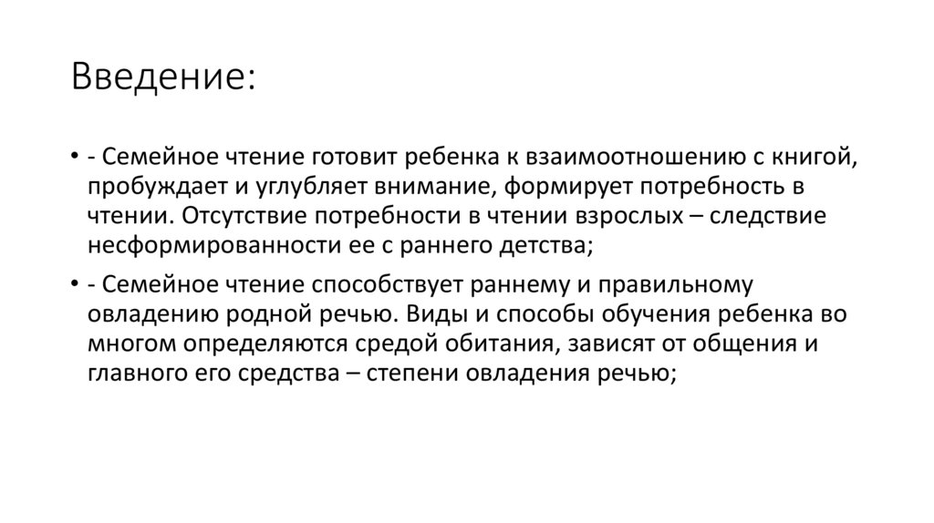 Введение:• - Семейное чтение готовит ребенка к взаимоотношению с книгой,