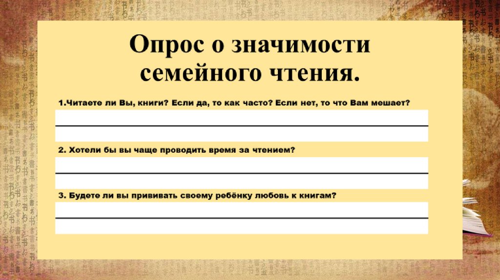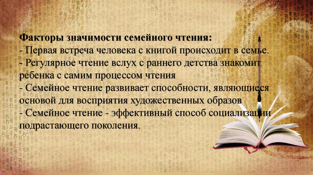 Факторы значимости семейного чтения:- Первая встреча человека с книгой происходит в семье.