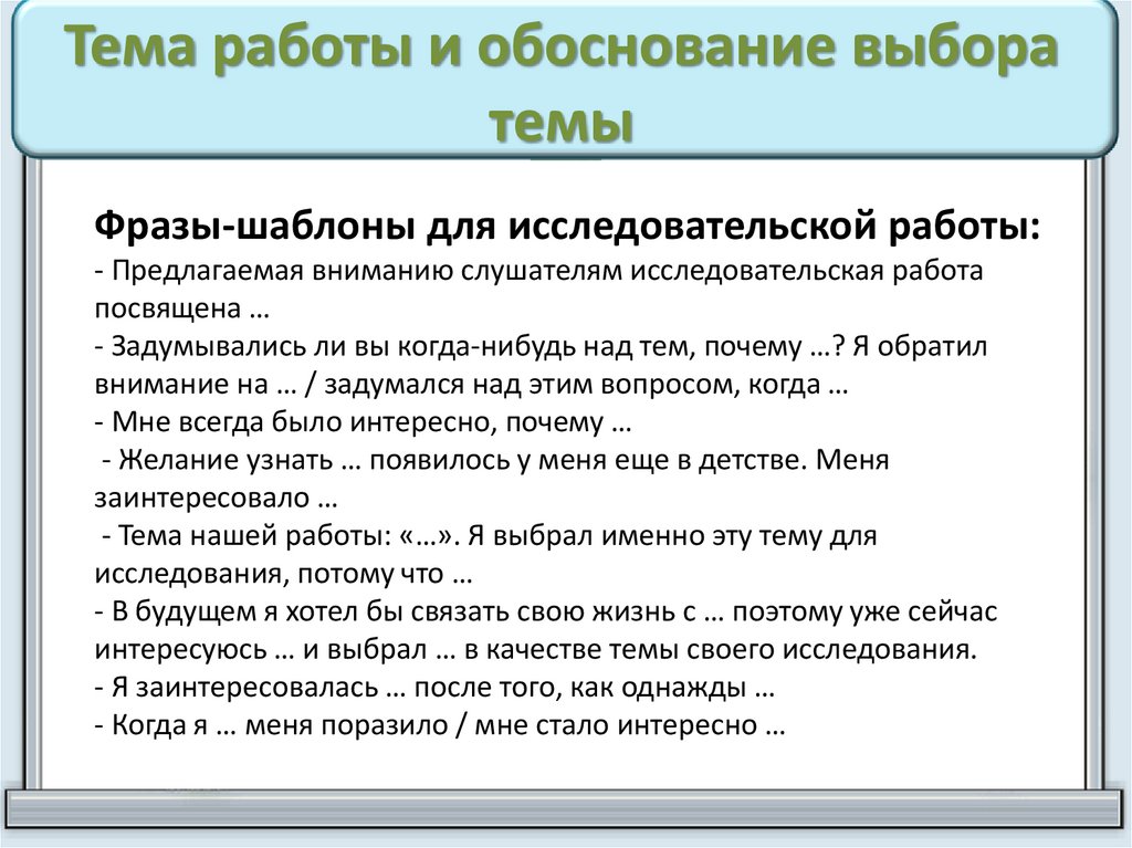 Фразы-шаблоны для исследовательской работы:- В процессе написания работы я узнал/ научился/ открыл