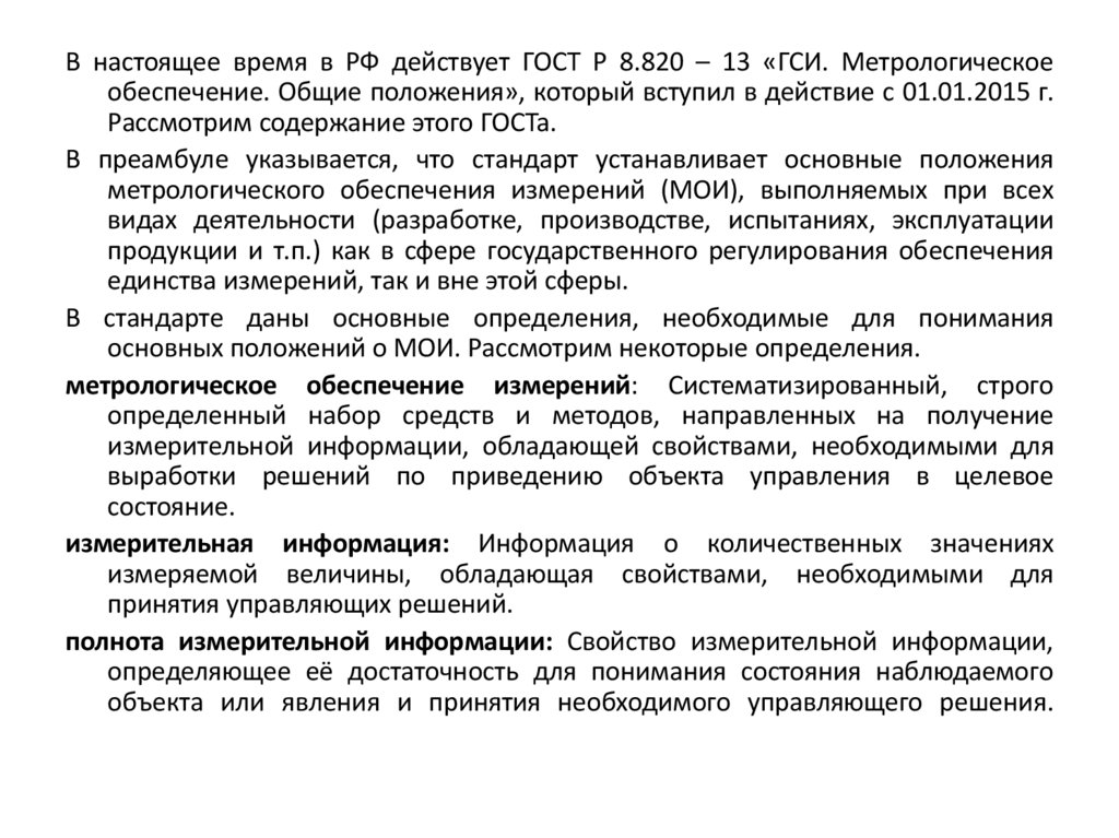В настоящее время в РФ действует ГОСТ Р 8.820 – 13 «ГСИ. Метрологическоеобеспечение. Общие положения», который вступил в действие с 01.01.2015 г.