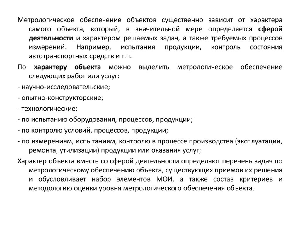 Метрологическое обеспечение объектов существенно зависит от характерасамого объекта, который, в значительной мере определяется сферой