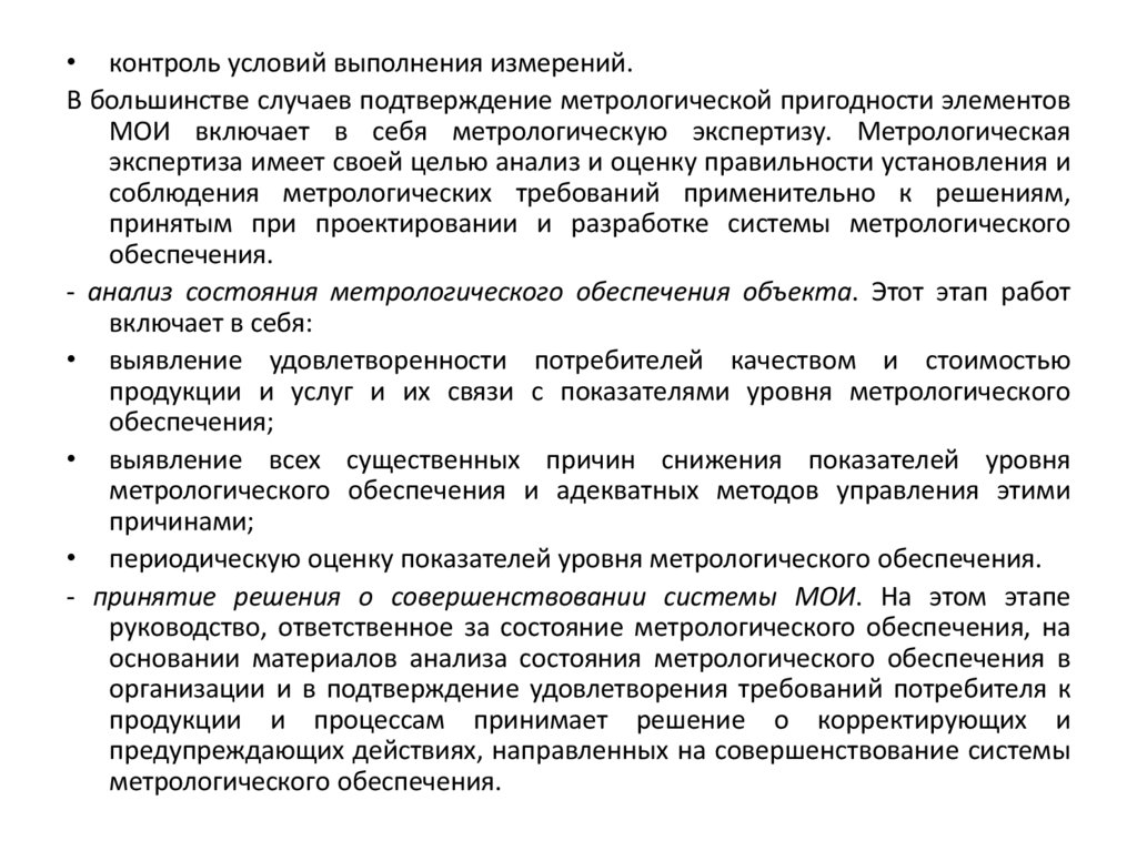 • контроль условий выполнения измерений.В большинстве случаев подтверждение метрологической пригодности элементов