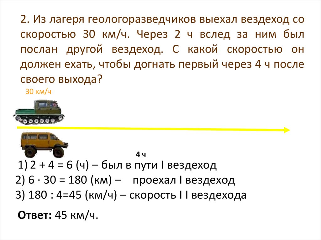 2. Из лагеря геологоразведчиков выехал вездеход соскоростью 30 км/ч. Через 2 ч вслед за ним был