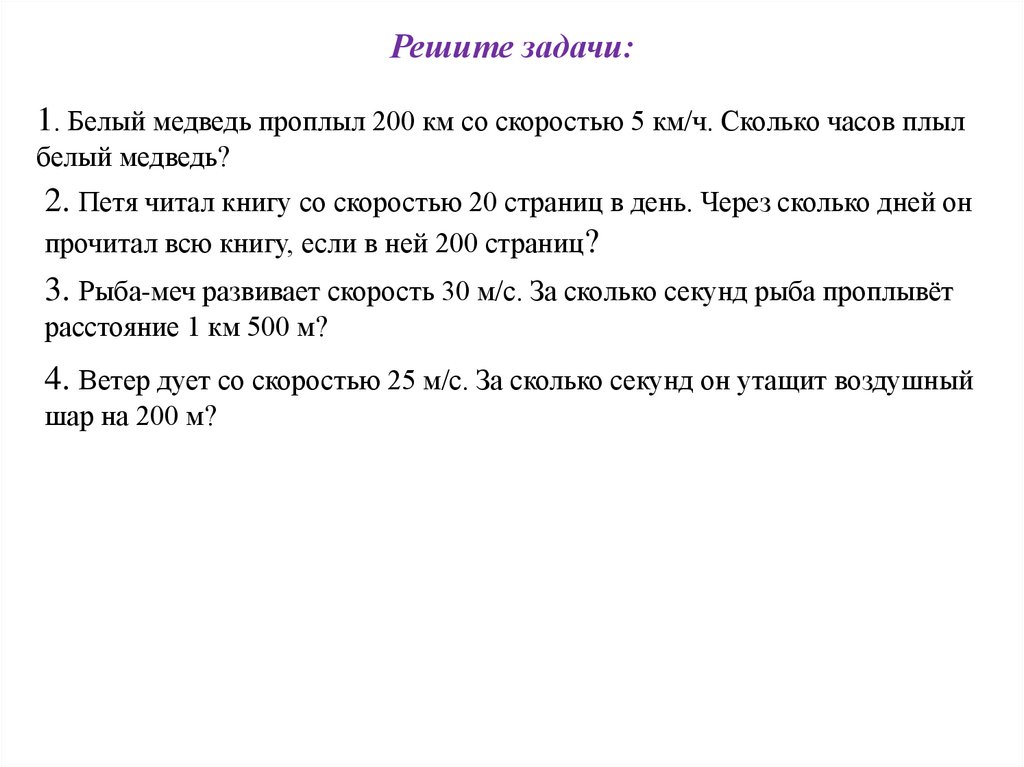 Решите задачи:1. Белый медведь проплыл 200 км со скоростью 5 км/ч. Сколько часов плыл