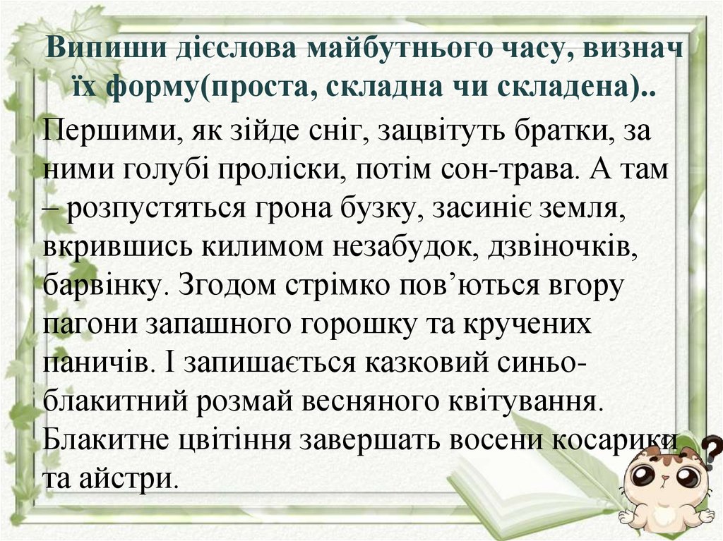 11. Випиши дієслова майбутнього часу, визнач їх форму(проста, складна чи складена)..