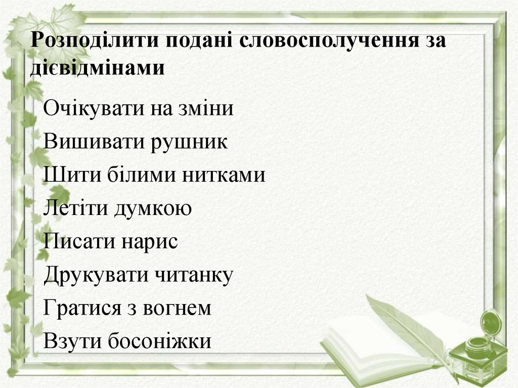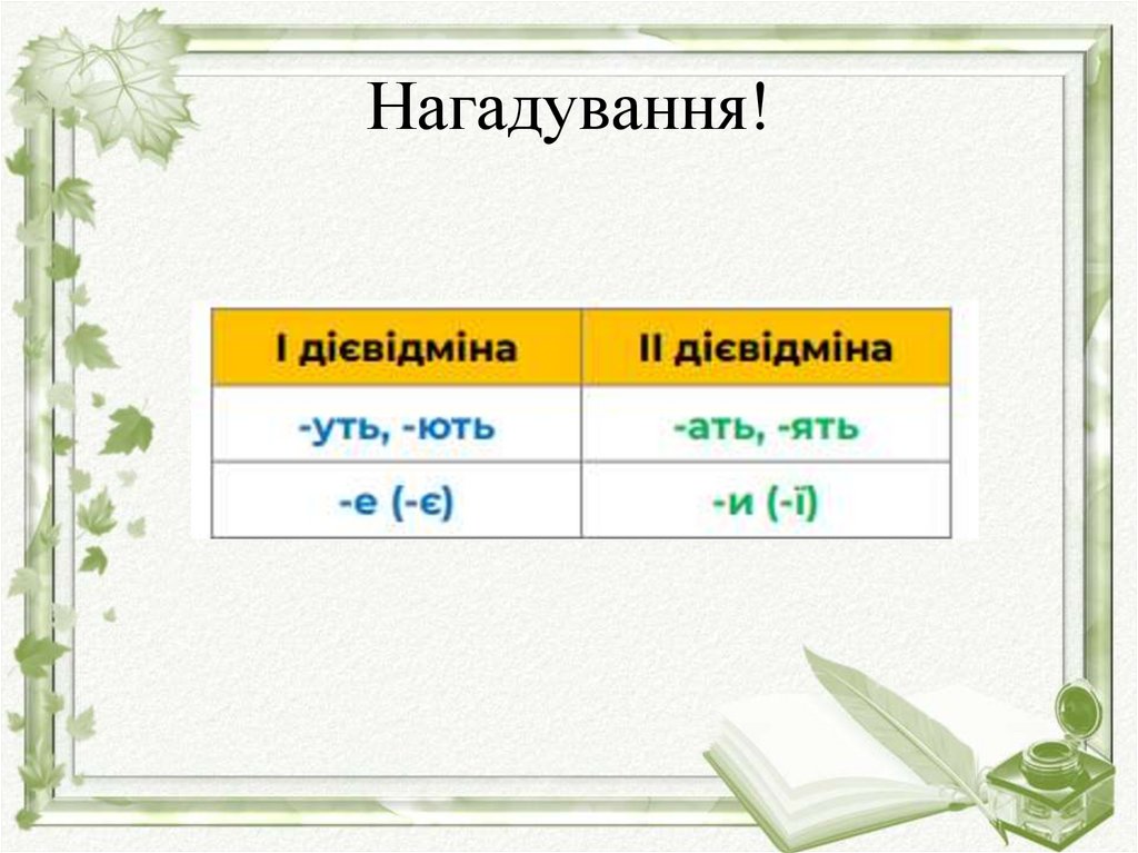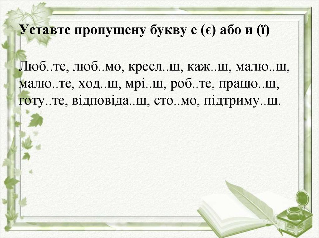 Люб..те, люб..мо, кресл..ш, каж..ш, малю..ш,малю..те, ход..ш, мрі..ш, роб..те, працю..ш,