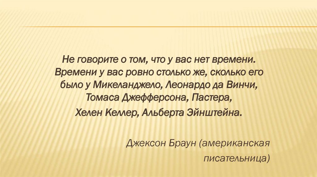 Не говорите о том, что у вас нет времени. Времени у васровно столько же, сколько его было у Микеланджело,