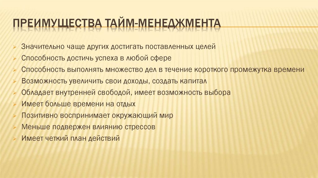 ПРЕИМУЩЕСТВА ТАЙМ-МЕНЕДЖМЕНТАЗначительно чаще других достигать поставленных целей