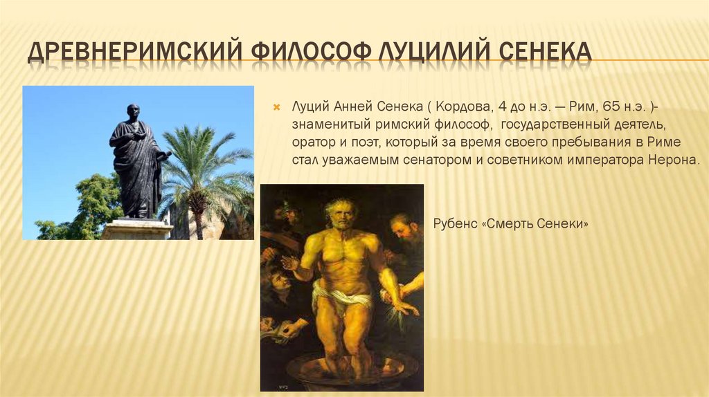 ДРЕВНЕРИМСКИЙ ФИЛОСОФ ЛУЦИЛИЙ СЕНЕКАЛуций Анней Сенека ( Кордова, 4 до н.э. — Рим, 65 н.э. )знаменитый римский философ, государственный деятель,