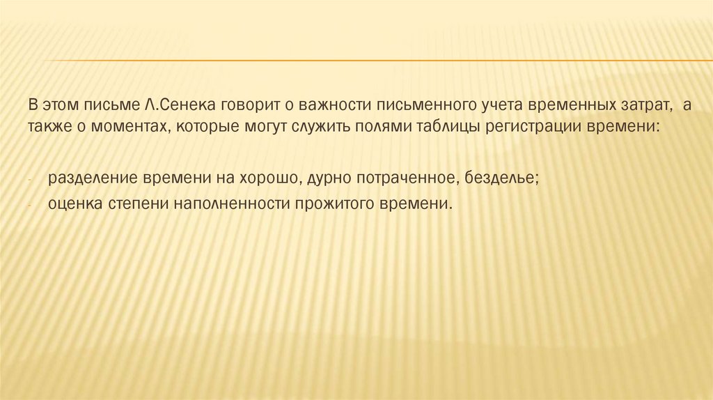 В этом письме Л.Сенека говорит о важности письменного учета временных затрат, атакже о моментах, которые могут служить полями таблицы регистрации времени: