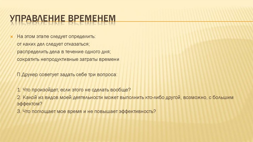 ЭТАПЫ УПРАВЛЕНИЯ ВРЕМЕНЕМПитер Друкер (кн. «Эффективный руководитель»):