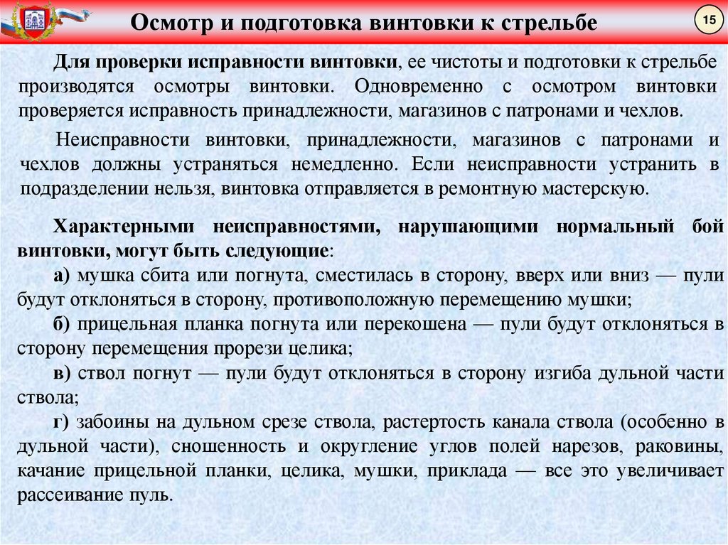 при ежедневном осмотре; проверить исправность оптического прицела,