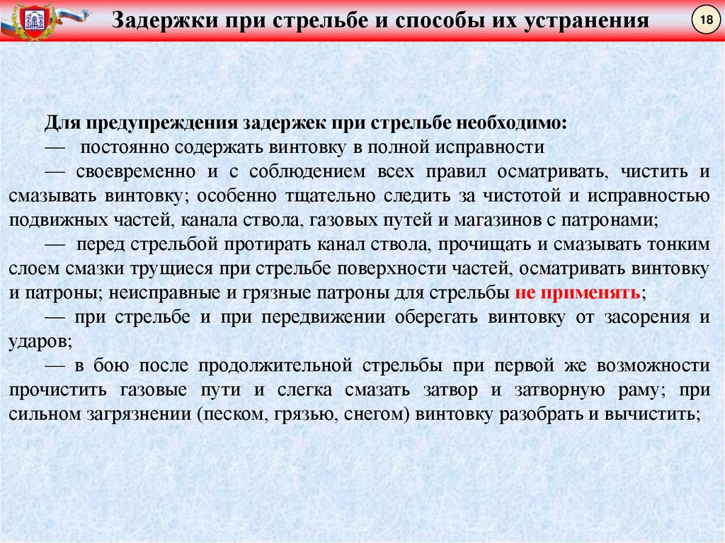 и патроны; неисправные и грязные патроны для стрельбы не применять;