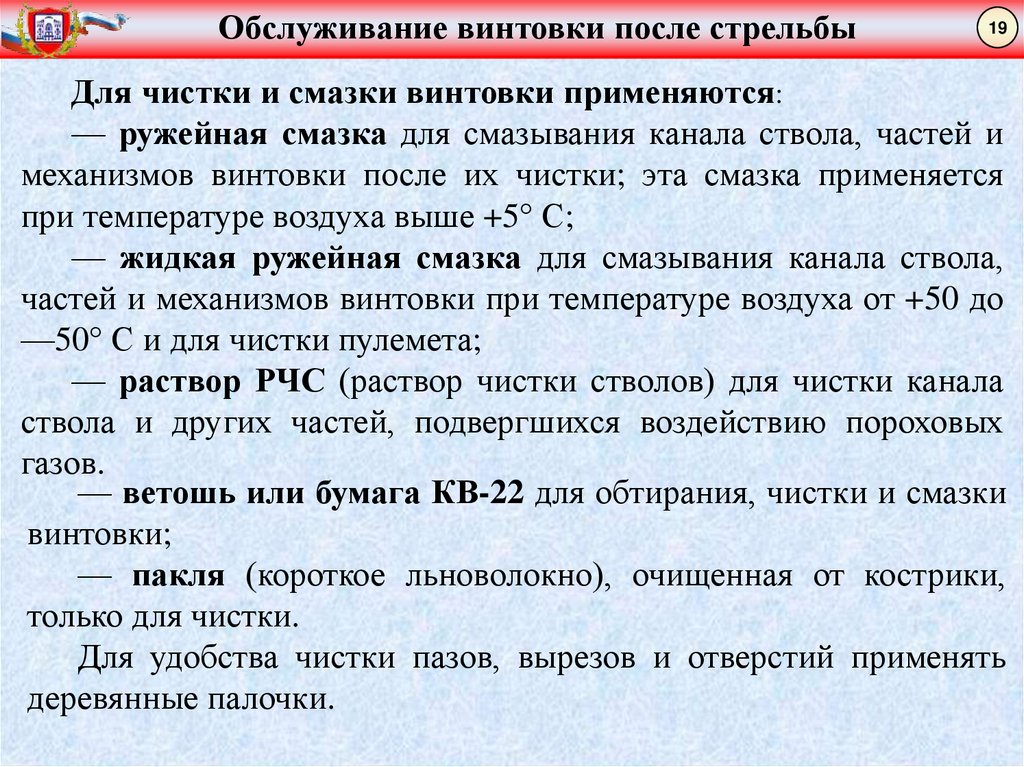 — перед стрельбой протирать канал ствола, прочищать и смазывать тонким