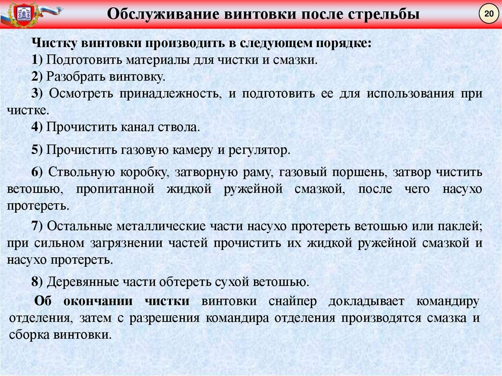 Обслуживание винтовки после стрельбыЧистку винтовки производить в следующем порядке: