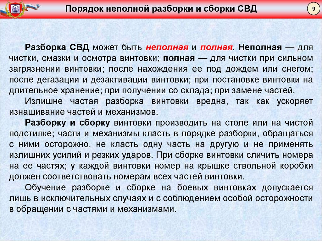 чистки, смазки и осмотра винтовки; полная — для чистки при сильном