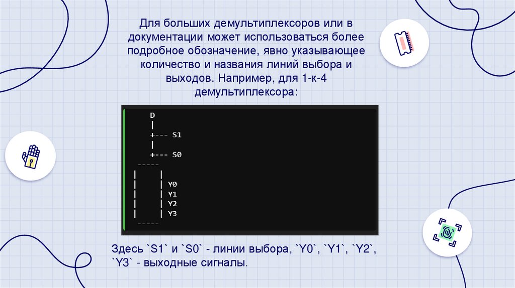 Здесь `S1` и `S0` - линии выбора, `Y0`, `Y1`, `Y2`,