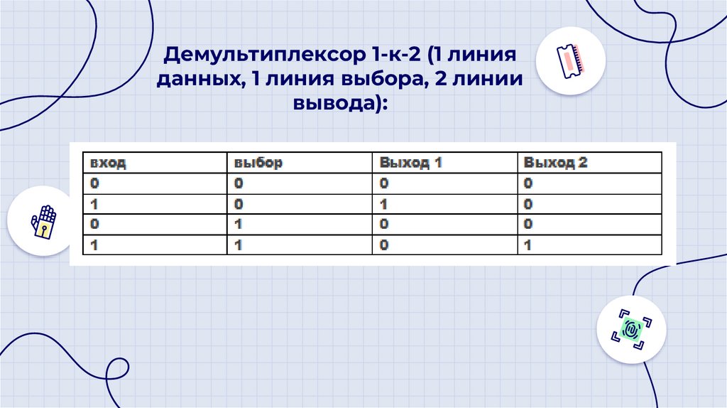 Демультиплексор 1-к-2 (1 линияданных, 1 линия выбора, 2 линии