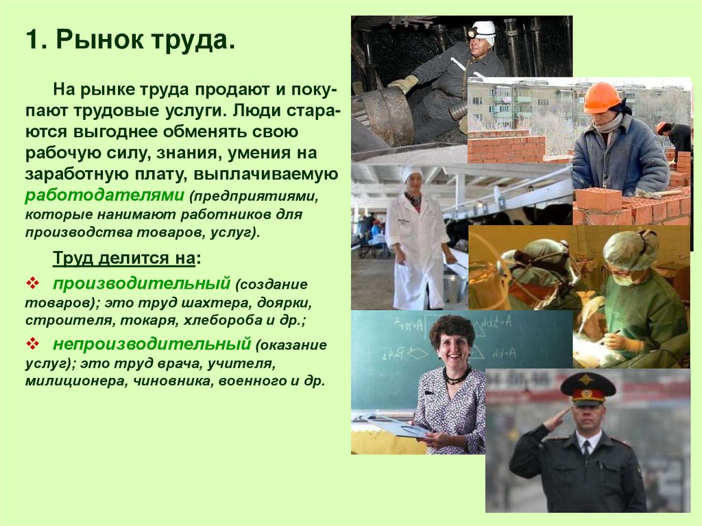 1. Рынок труда.На рынке труда продают и покупают трудовые услуги. Люди стараются выгоднее обменять свою