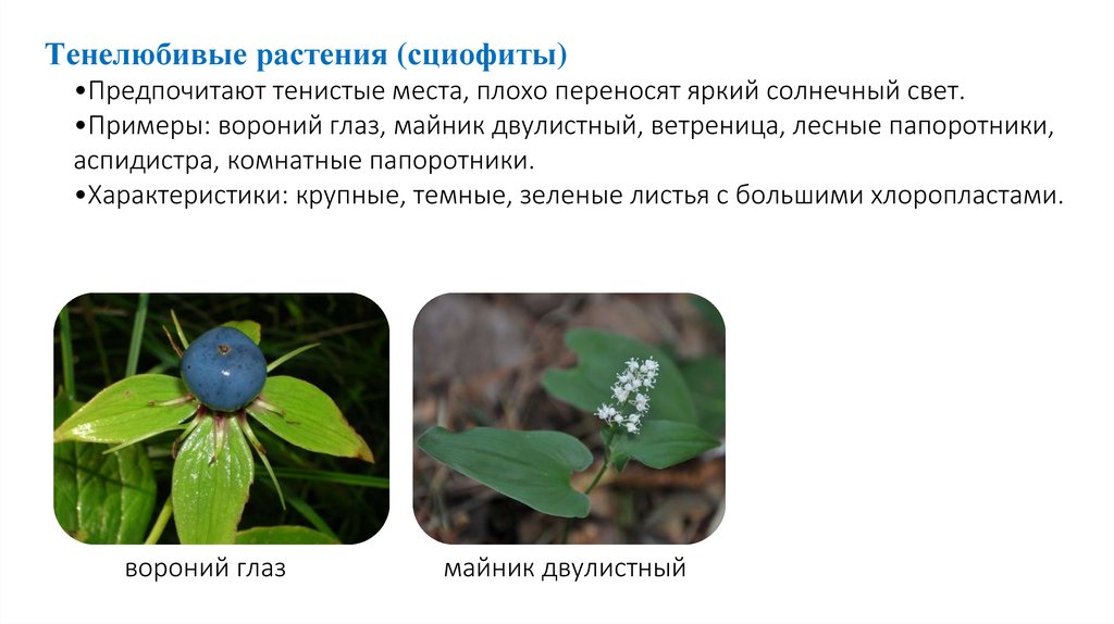 Тенелюбивые растения (сциофиты)•Предпочитают тенистые места, плохо переносят яркий солнечный свет.