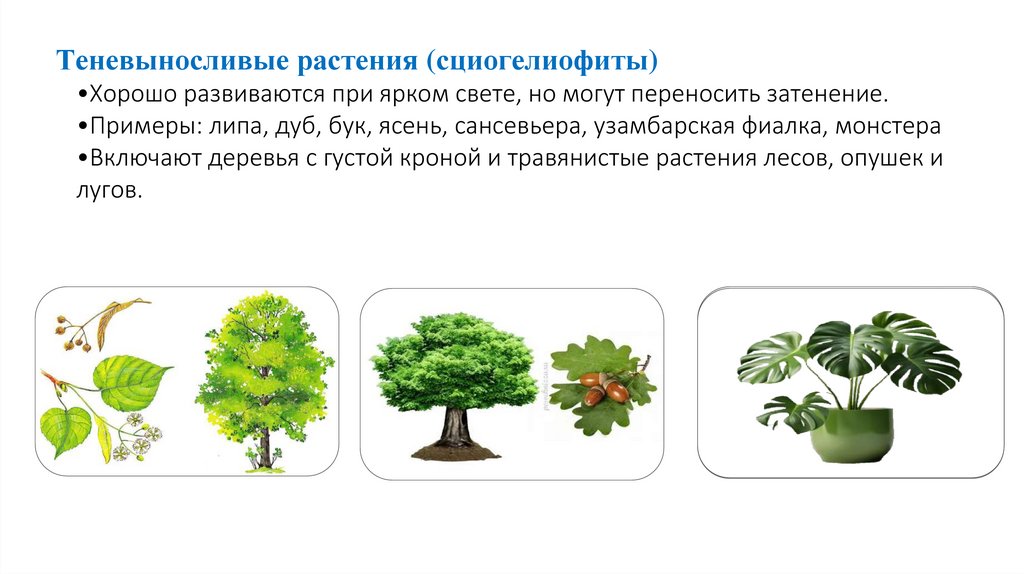 •Примеры: липа, дуб, бук, ясень, сансевьера, узамбарская фиалка, монстера