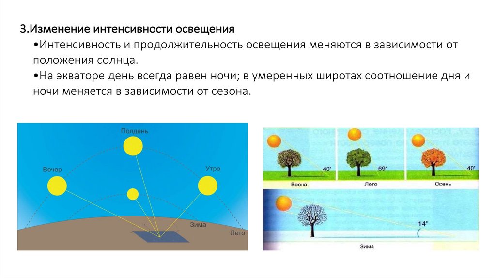 3.Изменение интенсивности освещения•Интенсивность и продолжительность освещения меняются в зависимости от