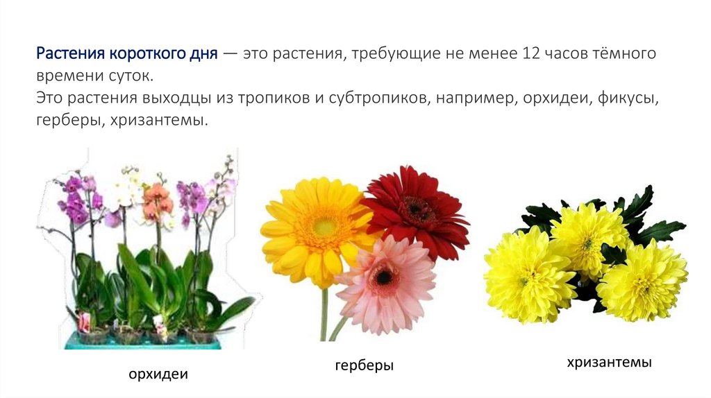 Растения короткого дня — это растения, требующие не менее 12 часов тёмноговремени суток.