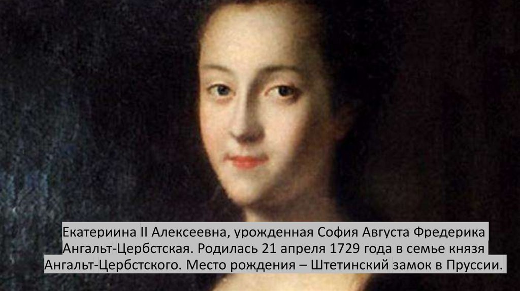 Екатериина II Алексеевна, урожденная София Августа ФредерикаАнгальт-Цербстская. Родилась 21 апреля 1729 года в семье князя
